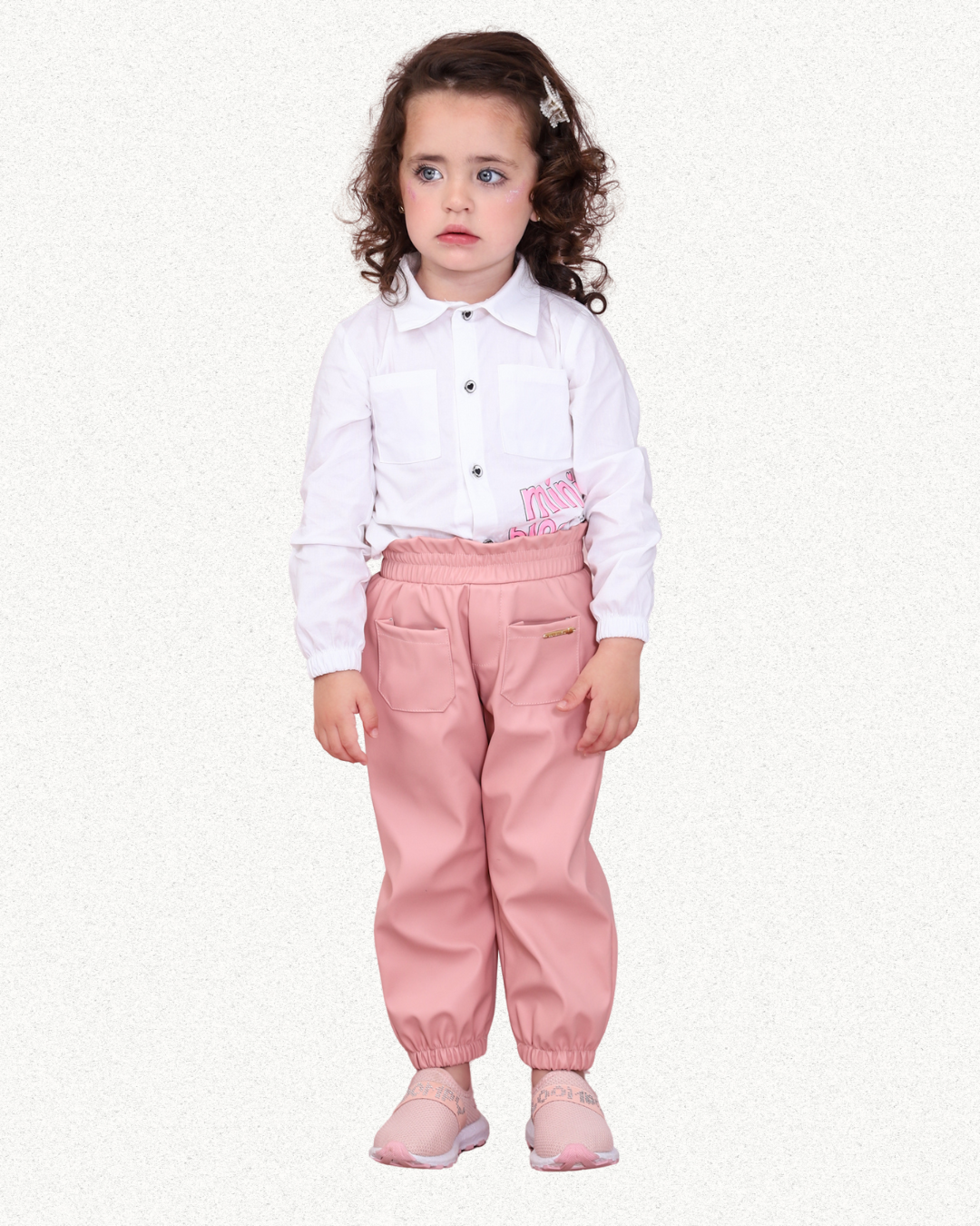 A Calça Couro Rosé Bambollina tem acabamento suave e caimento perfeito, destacando-se pelo design moderno e o brilho sutil do material sintético.
