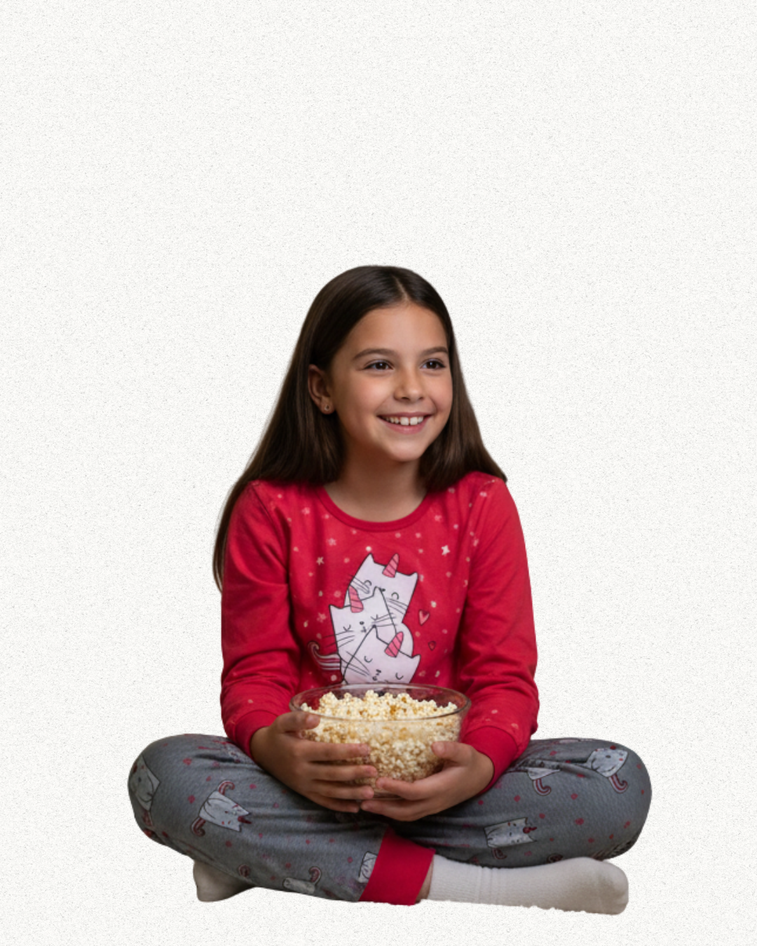 A blusa em malha macia na cor rosa vibrante traz uma estampa encantadora de gatinhos unicórnios dentro de uma xícara — o charme extra fica por conta da estampa que brilha no escuro, tornando o momento de dormir ainda mais mágico.