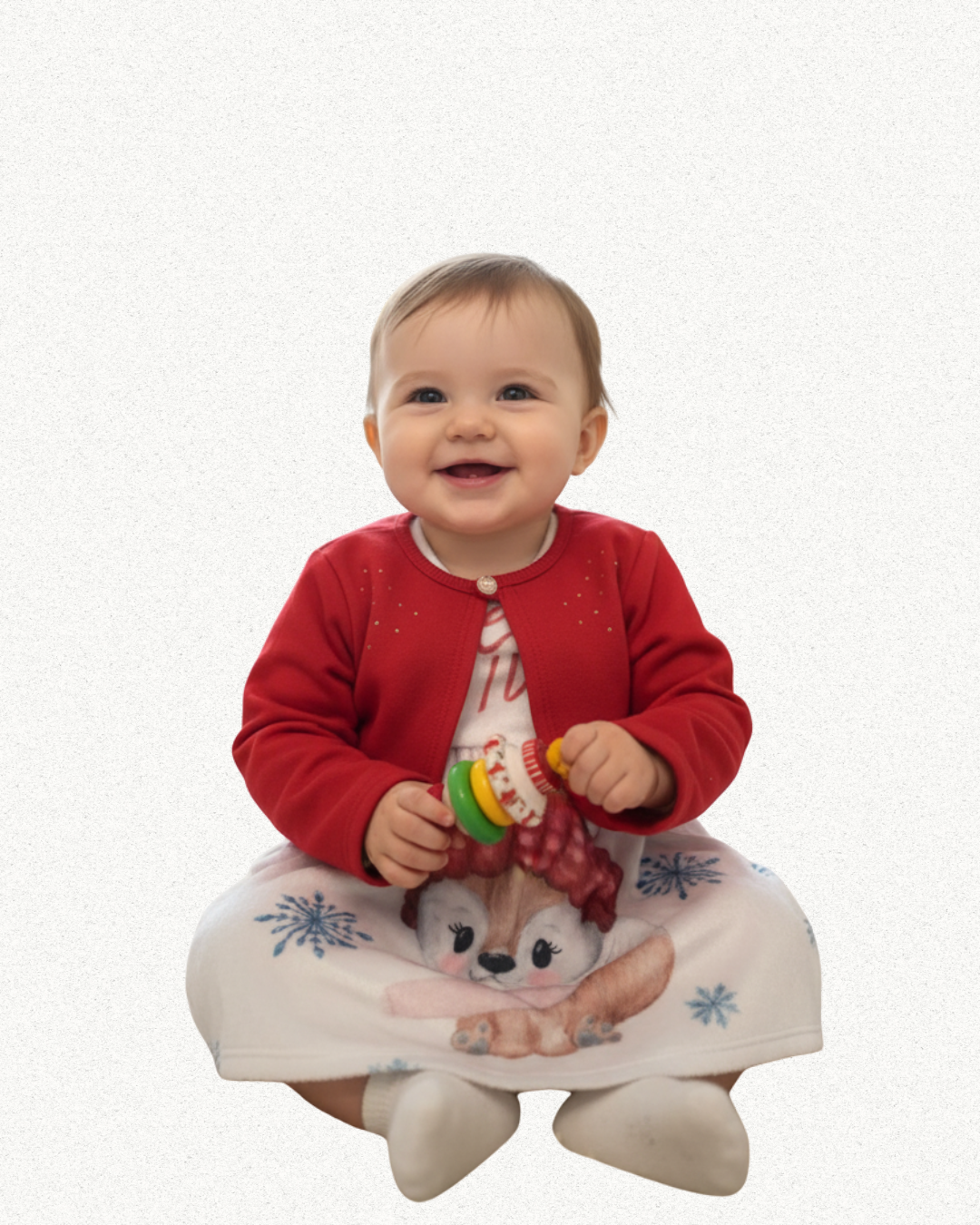 uma blusa flanelada super macia com estampa da raposinha sorridente — usando gorro e cachecol — e um bolero vermelho com aplicação de pequenas pedrinhas nos ombros, que dá o toque final de delicadeza e estilo.
