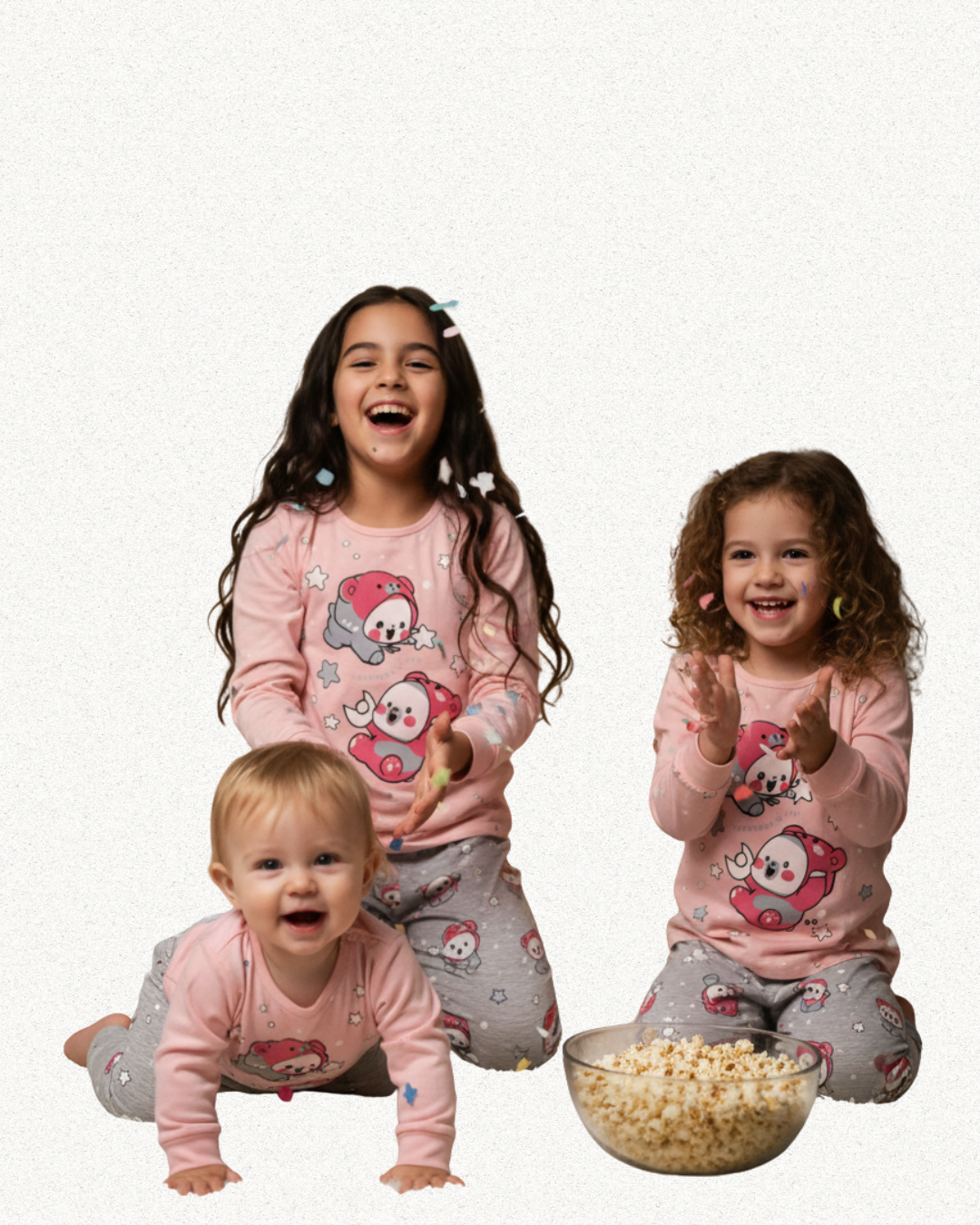 Com toque suave e modelagem confortável, o Conjunto Ursinhos Divertidos traz uma blusa rosa com estampa alegre de ursinhos e calça mescla cinza com elástico na cintura, garantindo liberdade e aconchego.