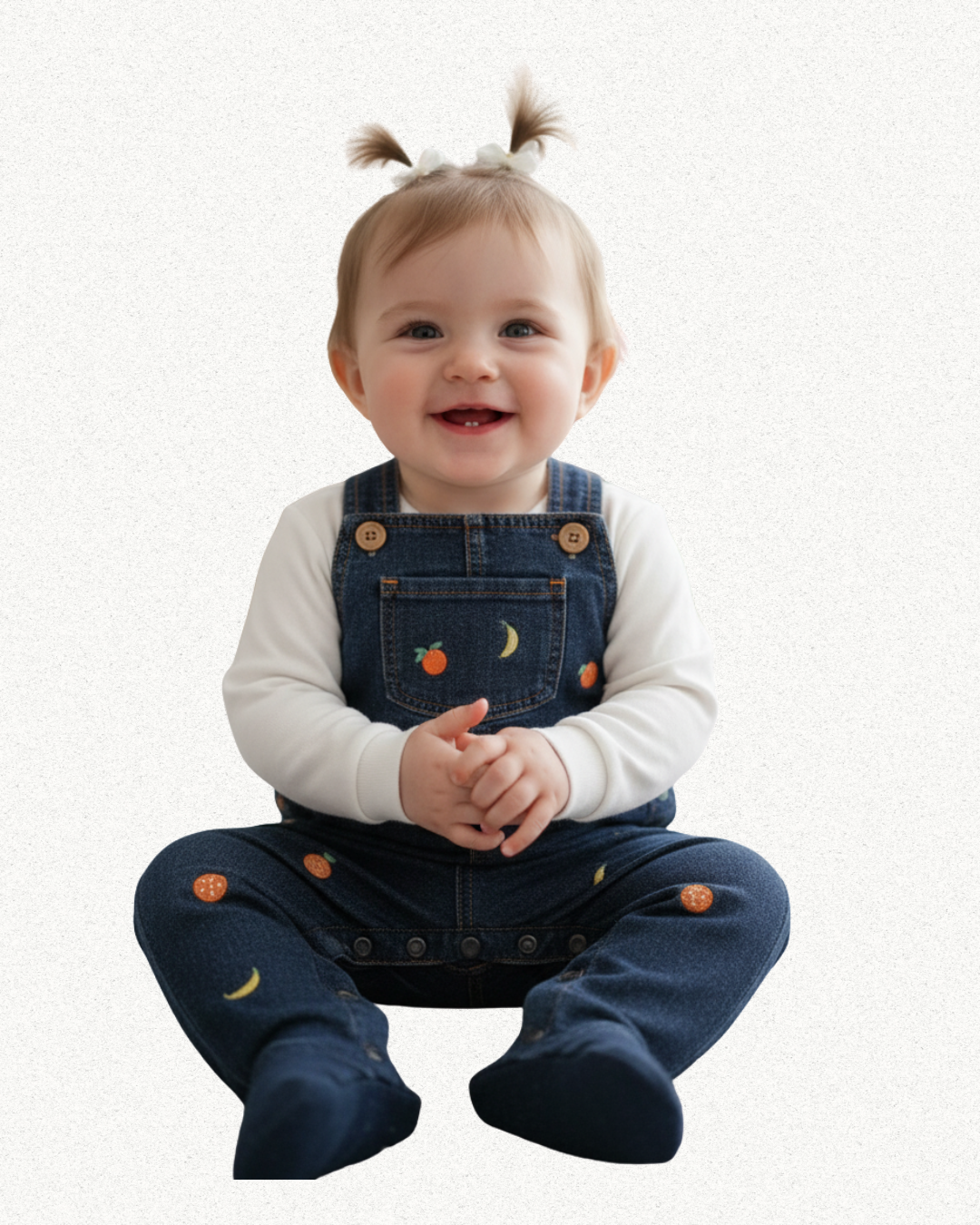 Feita em malha com efeito jeans, a Jardineira Frutas Tilly Baby combina conforto e praticidade no dia a dia.