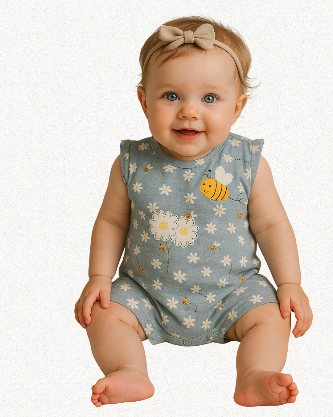 O Macacão Curto Margaridas e Abelhinhas combina leveza e praticidade, sendo ideal para os dias quentes.
